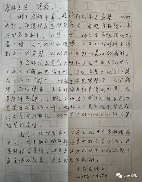 2018年10月,恰逢朱枫百岁寿辰,无锡市委宣传部、无锡市文联、新吴区人民政府主办“枫叶流丹”朱枫百岁绘画艺术展,江南晚报有幸作为承办方参与其中,为朱枫老先生拍摄了纪实影像资料。新吴区宣传部、梅村街道是画展主要承办方,朱枫曾长期工作和生活在梅村。1948年~1970年,他先后在梅村的无锡县师范和梅村中学任美术教师,桃李满天下。在他的大力支持下,从2018年开始,梅村街道先后制作了以朱老的24幅书画作品为插图的“诗里画里梅里”文化笔记本、设计制作了“枫叶流丹”梅里文化小镇宣传台历和宣传折页等。那次无锡历史上最高龄画家的特别画展,不乏重量级的嘉宾以不同形式表示祝贺——全国政协常委、中国美术家协会副主席、中国美术馆馆长吴为山,以及中国书法家协会学术委员、著名书法家华人德为画展题字,96岁的王木东大师还亲临现场祝贺及观摩。2018年朱枫百岁绘画艺术展,王木东大师对朱老翘起了大拇指,这是他们首次见面。王木东写给张孝林的信中说,他把朱枫的画集摆在床头,感受画作中发自灵魂深处的爱与憎,以及展现的人生风雨拼搏。