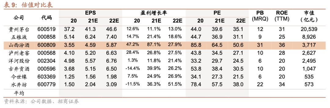 毛利率提升,销售费用率下行,预计21-25年利润CAGR=27%。山西市场及环山西市场费用率持续下行,长江以南市场目前进入高投入期,我们预计汾酒整体销售费用率呈下降趋势(费用计入方法可能也致使毛利率呈上升趋势),预计2025年公司毛利率为76.7%,较2020年提升4.5个百分点,公司销售费用率为12.4%,较2020年降低3.9个百分点,预计21-25年利润CAGR=27%,高于收入增长。