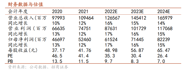 Q4实现收入/利润同比+14.0%/18.1%,十四五开局顺利。公司21年实现营业收入/净利润/扣非归母净利润分别为1061.9/524.6/525.8亿,同比+11.8%/+12.34%/+11.84%,顺利完成年初10.5%的增长规划。其中,Q4实现营业总收入、利润分别为324.1、151.9亿,同比+14.0%、18.1%,略超年初公告指引,实现十四五开局之年的圆满收官。现金流方面,21年公司销售收现1193亿,同比+11.49%,与收入增速基本相符。21年末公司合同负债+其他流动负债142.54亿,环比20年末减少6.78亿。公司拟每股派发现金红利21.675元(含税),分红比例51.7%。本次公司同时披露了英文版年度报告和ESG报告,象征着公司国际化战略再进一步。