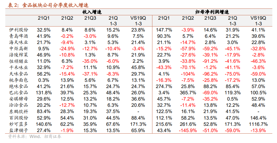 21整体消费疲软,调味品、零食收入承压。从21年情况来看,整体消费力相对疲软,社零增速仍在恢复,同时社区团购对渠道有所冲击,调味品、零食行业受收入承压。调味品整体受餐饮需求拖累及社区团购冲击显著,其中,海天Q2收入下滑,中炬、恒顺、天味等调味品企业前三季度增速下滑。洽洽受高基数影响,Q2收入增速承压,盐津铺子Q2受社区团购影响,收入下滑。另一方面,乳品、连锁食品、啤酒等板块去年受疫情影响基数较低,21年实现了一定程度的复苏,收入增速稳健。