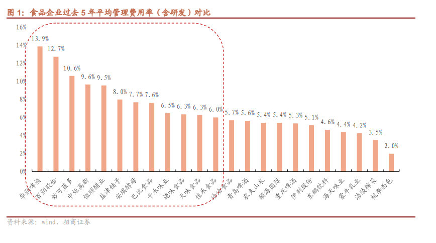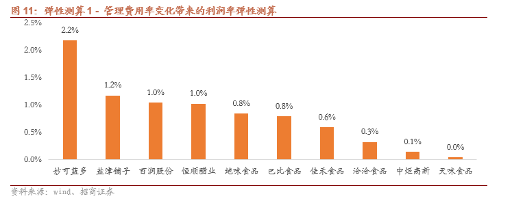 管理费用、广告支出是常见的产生经营杠杆的科目。在收入波动的情况下,与收入挂钩的成本、费用会出现同方向的变化,但部分固定费用的投入却不随收入的波动而明显变化且短期难以调节,这导致收入变化对利润率的影响被经营杠杆进一步放大。其中,比较常见的能产生经营杠杆的费用支出包括管理费用(含研发,下文管理费用及管理费用率测算均含研发费用),比如管理\研发人员薪酬,折旧,办公费用,差旅费用,水电费用等,以及广告费用(通常是年初进行规划和投放,但短期未必对收入规模扩张产生明显效果)。21年食品行业整体需求承压,很多企业收入下滑或增速放缓,利润率进一步受损。而由于经营杠杆的存在,我们假设明年收入恢复到正常增速,具有更高经营杠杆的公司将有望实现更高业绩弹性。影响公司业绩的因素众多,本报告在前述假设与逻辑下,仅从经营杠杆的角度,优选具有较大净利润恢复弹性的个股,挖掘食品行业22年投资机会。