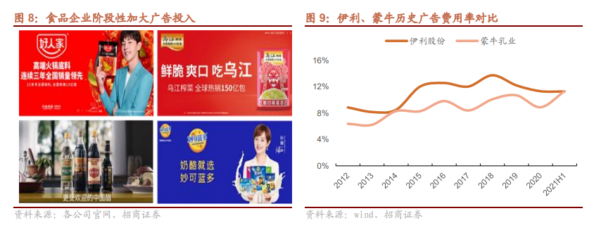 广告支出加大企业,利润受到拖累。21年虽然需求端承压,但一些食品企业如涪陵榨菜、千禾味业、天味食品等仍逆势加大了宣传投入,导致业绩进一步受到拖累。此外,伊利、蒙牛在乳制品行业双寡头格局下,在广告宣传方面持续进行了大量的投入,广告费用率均始终处在较高水平,短期尚未影响公司利润率,未来如果有所收缩,将有可能产生相对较高经营杠杆。