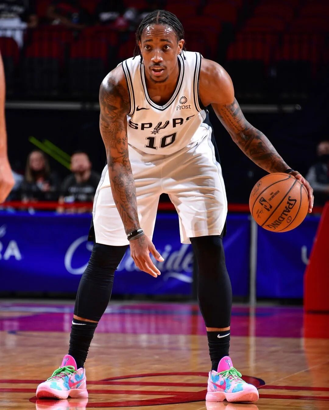可以看出德罗赞此次上脚的 PE 配色整体采用大面积骚粉色装扮,鞋舌以及侧身 Swoosh Logo 则是以不同色调的粉色装饰,带来极为抢眼的视觉效果。