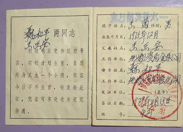 聂和平王正安夫妇的独生子女证。