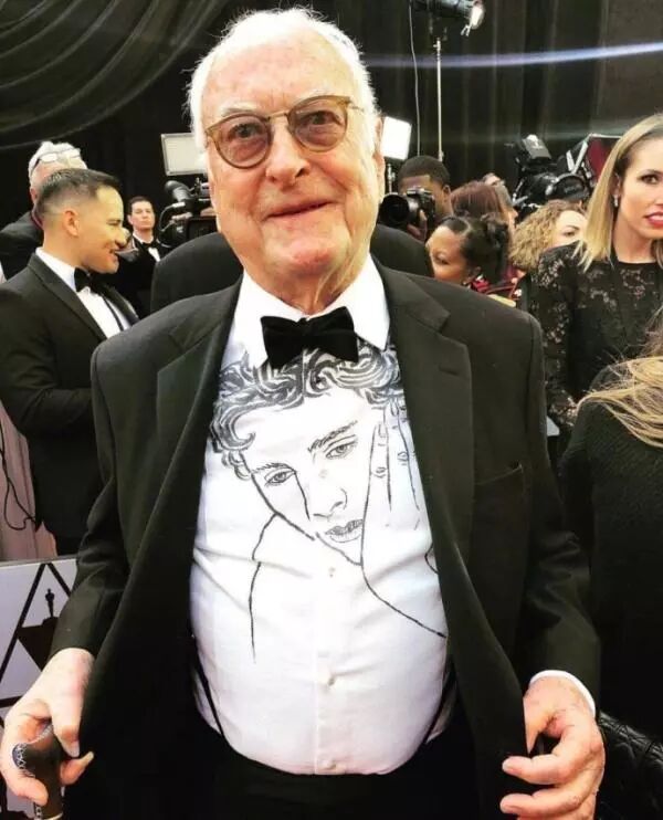 詹姆斯老爷爷的衬衫十分俏皮,上面印有《请以你的名字呼唤我》主演“甜茶”提莫西·查拉梅的头像。