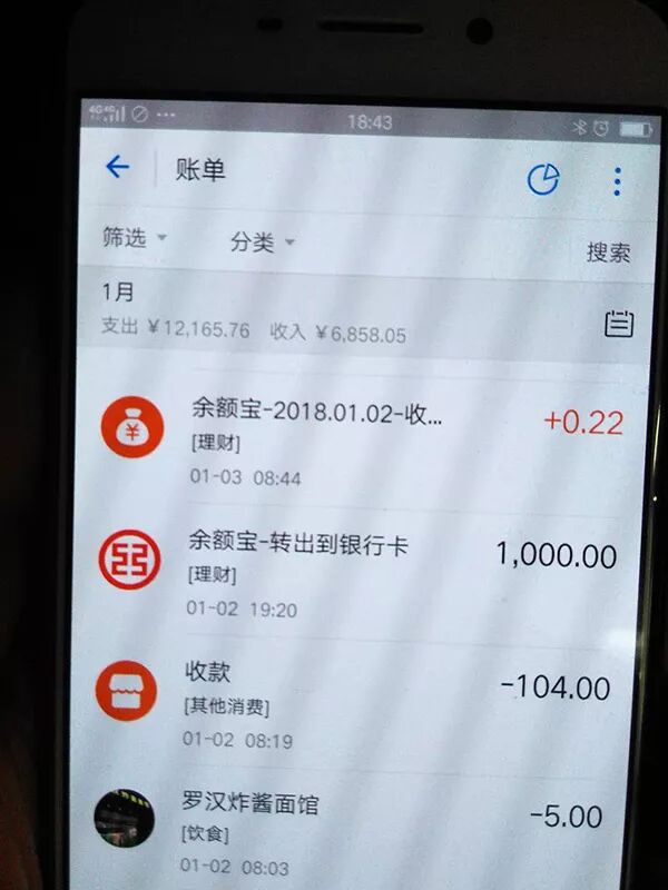 罗正宇2018年1月的支付宝账单。
