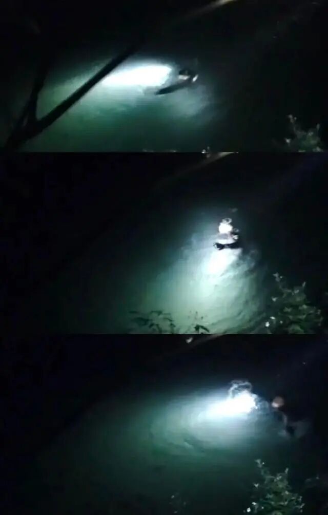 晚上的水下冰冷刺骨,冯叶嘉朝着上游游了10多秒后,湍急的河水使他停止了前进,在原地几秒后,身体便顺着水流朝下游流去。