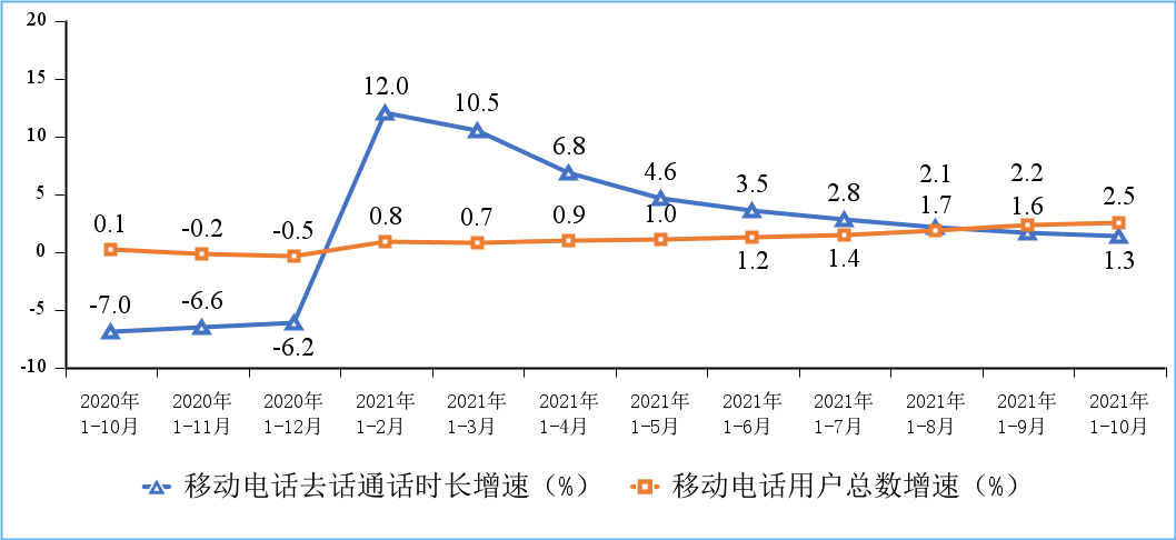 图7 2020-2021年1—10月份移动电话用户增速和通话时长增速