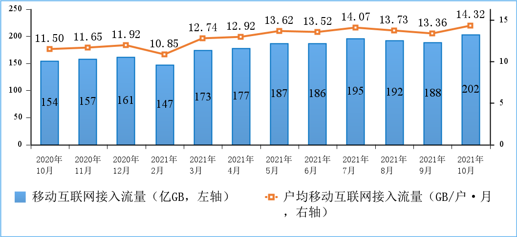 10月份当月户均移动互联网接入流量(DOU)达到14.32GB/户·月,同比增长25%,比上年底高2.4GB/户·月。