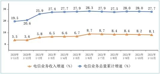图1 2020-2021年1—11月份电信业务收入和电信业务总量累计增速