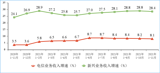 图2 2020-2021年1—11月份新兴业务收入增长情况