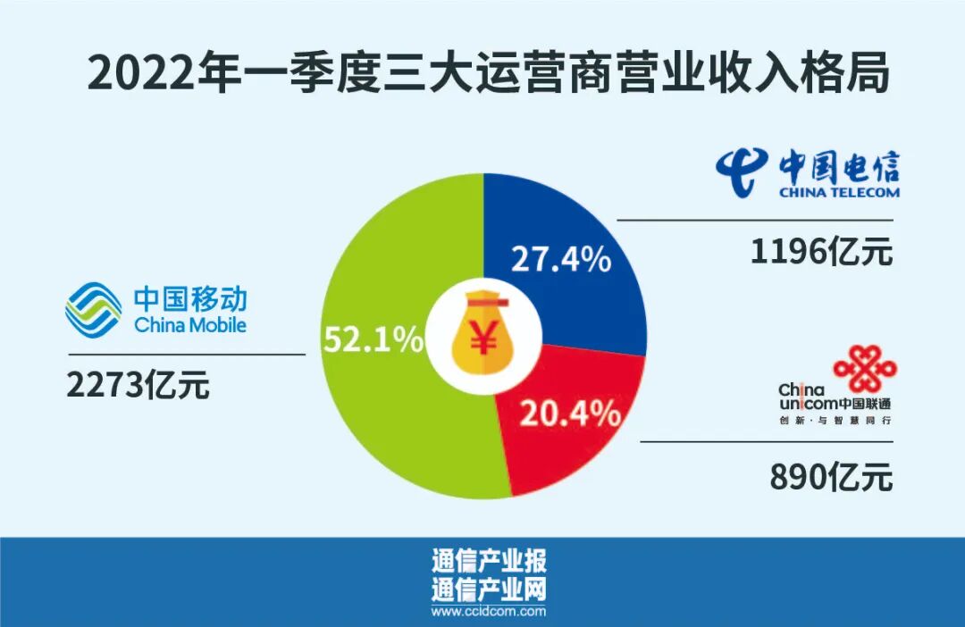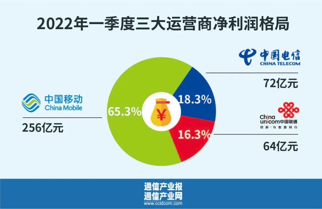 4月20日到21日两天,三大运营商陆续发布了今年第一季度业绩。在今年国内外特别的经济大势之下,运营商第一季度开局备受关注。季报显示,第一季度三大运营商的主要经营业绩指标都取得高增长,实现开门红。据三大运营商公告,今年前三个月,中国电信营业收入为1196亿元,同比增长11.9%;中国联通实现营业收入890亿元,同比增长8.2%;中国移动营业收入达2273亿元,同比增长14.6%。利润方面,中国电信股东应占利润为72亿元,同比增长12.1%;中国联通股东应占利润为64亿元,同比增长20.6%;中国移动股东应占利润为256亿元,同比增长6.5%。在一家独大的格局之下,三大运营商业绩在第一季度实现了高速增长。其中,中国联通的营收、利润还都创上市以来同期最高水平。中国电信再现了营收与利润的双双增长。运营商业绩的增长也反映在工信部的统计数据中。据工信部的数据,今年第一季度,通信业累计完成电信业务收入3935亿元,同比增长9.3%。