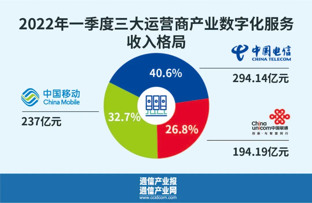 第一季度,三大运营商主营业务收入都实现了近10%的增长。据公告,今年第一季度,中国电信通信服务收入达1100亿元,同比增长9.9%;中国联通通信服务收入为812亿元,同比提升9.8%;中国移动实现通信服务收入1938亿元,同比增长9.1%。通过这组数据可以看到,中国电信和中国联通的增速几乎并驾齐驱,均超过了中国移动。显示在一家独大之下,这两家运营商的进取与努力,同时中国移动的主营业务收入继续保持领先。良好业绩背后,直接面向数字经济的产业数字化业务功不可没,已经成为运营商一季度业绩增长的强劲引擎。据公告,今年第一季度,中国电信产业数字化业务收入294.14亿元,同比增长23.2%;中国联通实现产业互联网业务收入194.19亿元,同比大涨34.8%;中国移动DICT业务收入达到237亿元,同比增长50.9%。