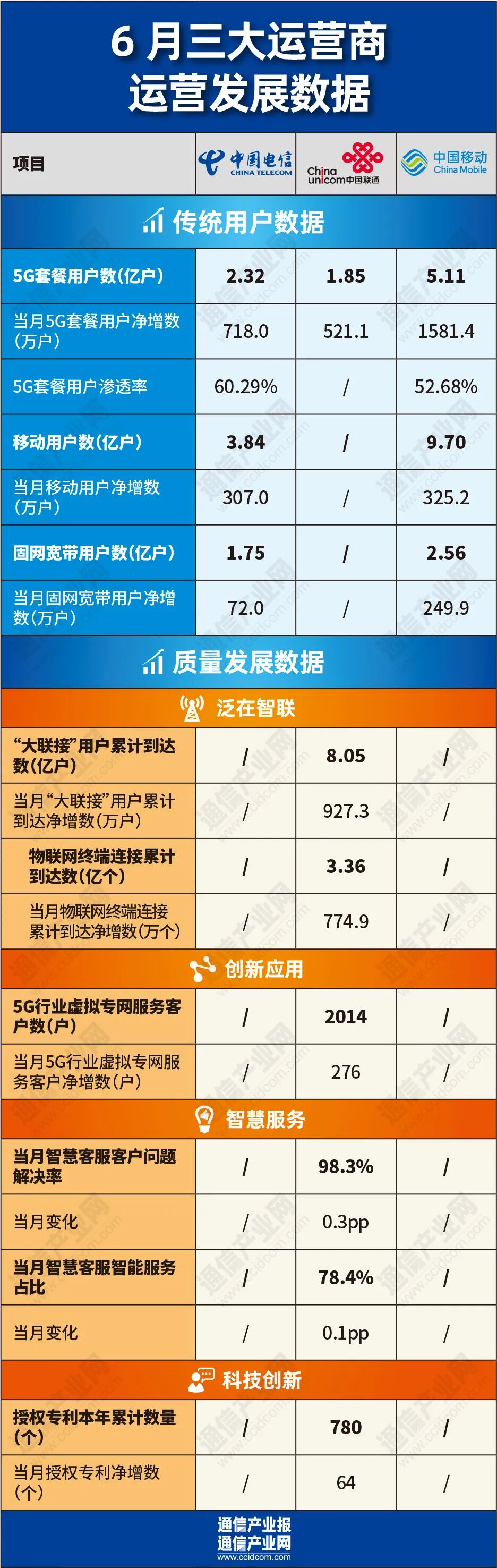 7月20日,三大运营商公布了今年6月运营数据,至此半年成绩也同时出炉。5G业务表现亮眼,行业市场发展持续向好。