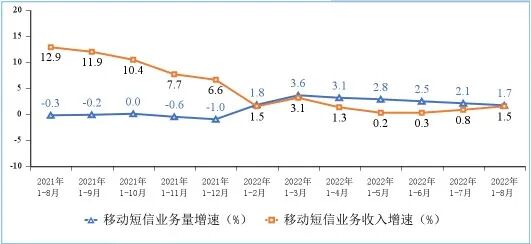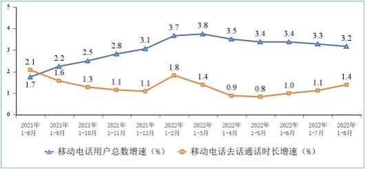 移动电话通话量低速增长,移动短信业务收入增速小幅提升。1—8月份,移动电话去话通话时长完成1.52万亿分钟,同比增长1.4%;固定电话主叫通话时长完成557.4亿分钟,同比下降11.1%。1—8月份,全国移动短信业务量同比增长1.7%,移动短信业务收入同比增长1.5%,增速较1—7月份分别回落0.4个和提升0.7个百分点。