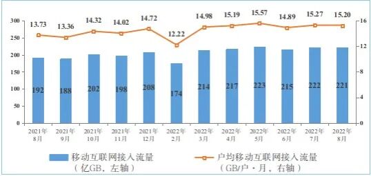 移动互联网流量较快增长。1—8月份,移动互联网累计流量达1684亿GB,同比增长18.6%。截至8月末,移动互联网用户数达14.59亿户,比上年末净增4337万户。8月当月户均移动互联网接入流量(DOU)达到15.2GB/户·月,同比增长10.7%,比上年底高0.48GB/户·月。