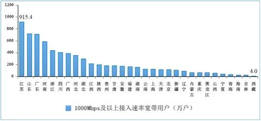 图9 2022年8月份1000Mbps及以上接入速率的宽带接入用户各省情况。