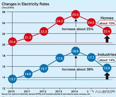 如下图所示,由于日本的地震灾害使得从2011年开始,核能一直出于低谷运行。2011年福岛核电事故后,电价是上升的,工业用电价格从13.7日元/kWh;居民用电价格20.4日元/kWh,最高的幅度都有25%和38%,在重启核电站以后才有一些价格下来的迹象。依靠天然气和煤炭的发电,从排放和成本角度来看,无法支撑BEV。这也是日本在很早做纯电动汽车,但是在本国BEV一直被HEV碾压的核心原因。