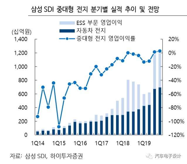 LG化学和三星SDI两家公司分别在第一季度做了处理,大电池方面的业务的盈利情况采取了处置:LG采取了1200亿韩元的处理,包括一次性的800亿韩元ESS火灾的处置费用,所以如下图所示,这个季度的运营情况收到了影响。