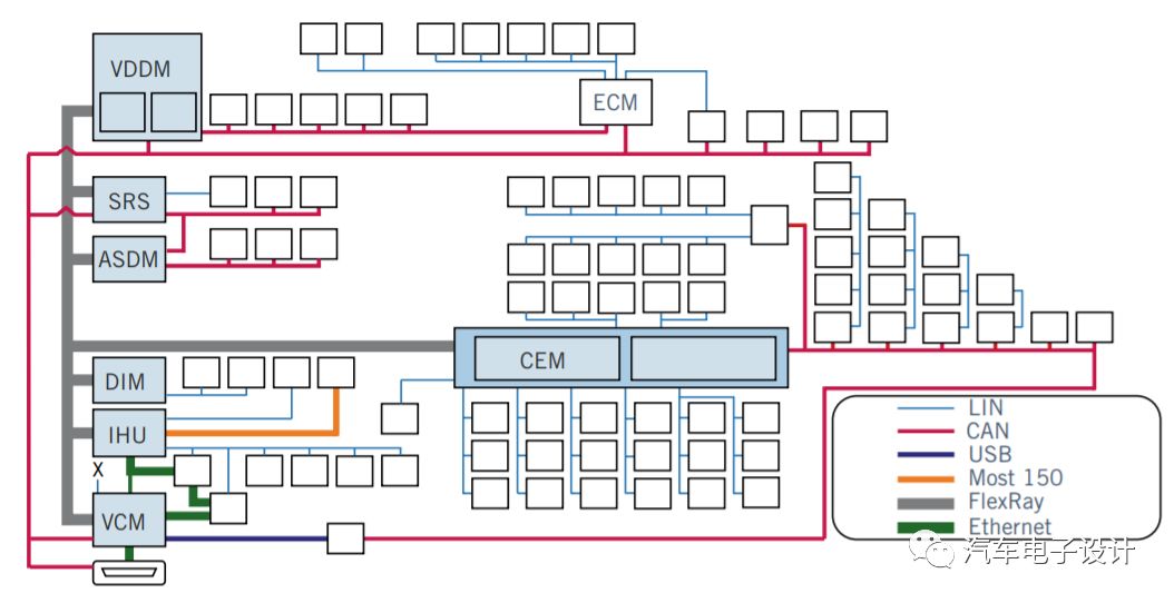 和BMW一样,Volvo在2011年的总线构建版本中就把CEM演化成为一个中央的控制器,涉及不少的功能。在网络控制里面,Volvo很早把CEM不仅仅作为车身控制,而是作为一个车辆系统管理的控制模,涉及多路LIN和主控车身高速CAN网络。如果我们从5年的跨度来看,早期CEM是个网关,在2010年左右变成一个域控制器,通过Flexray和其他功能域进行通信。