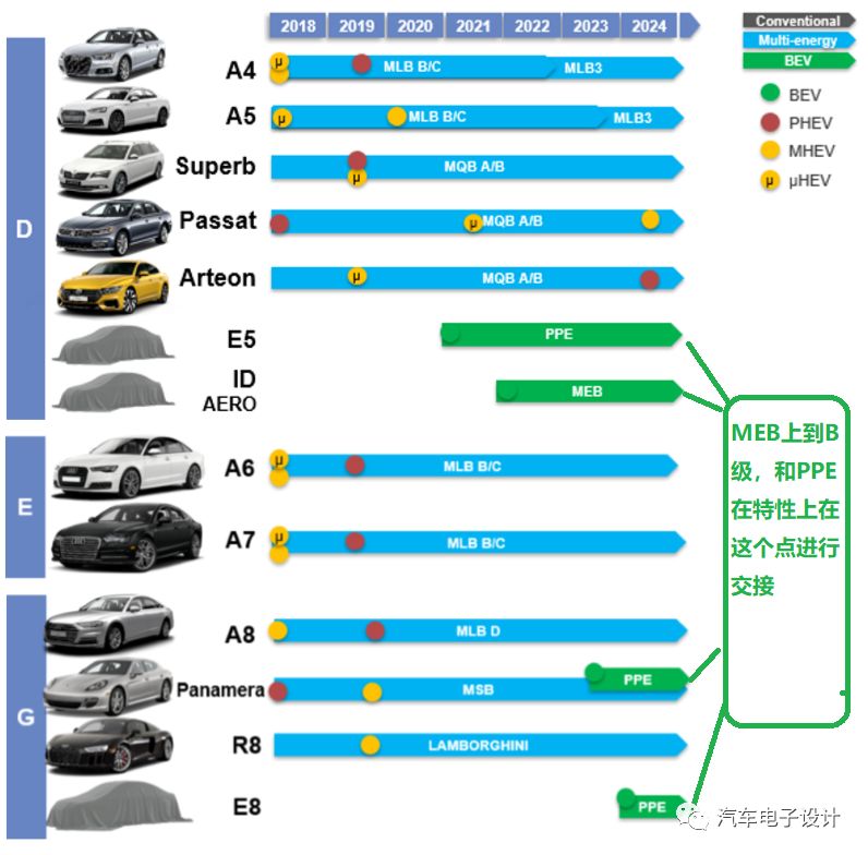 在较大的车型方面,特别是ID AERO上面采用MEB,这里和PPE会有个交叉,两个平台的各种特性上会有较大的差异,但是是有一些重叠的。由于再在上面叠加车型,是走电动汽车的盈利路线,所以在这里需要看几台跑车的实际表现,来拉动行政级车型的电动化。