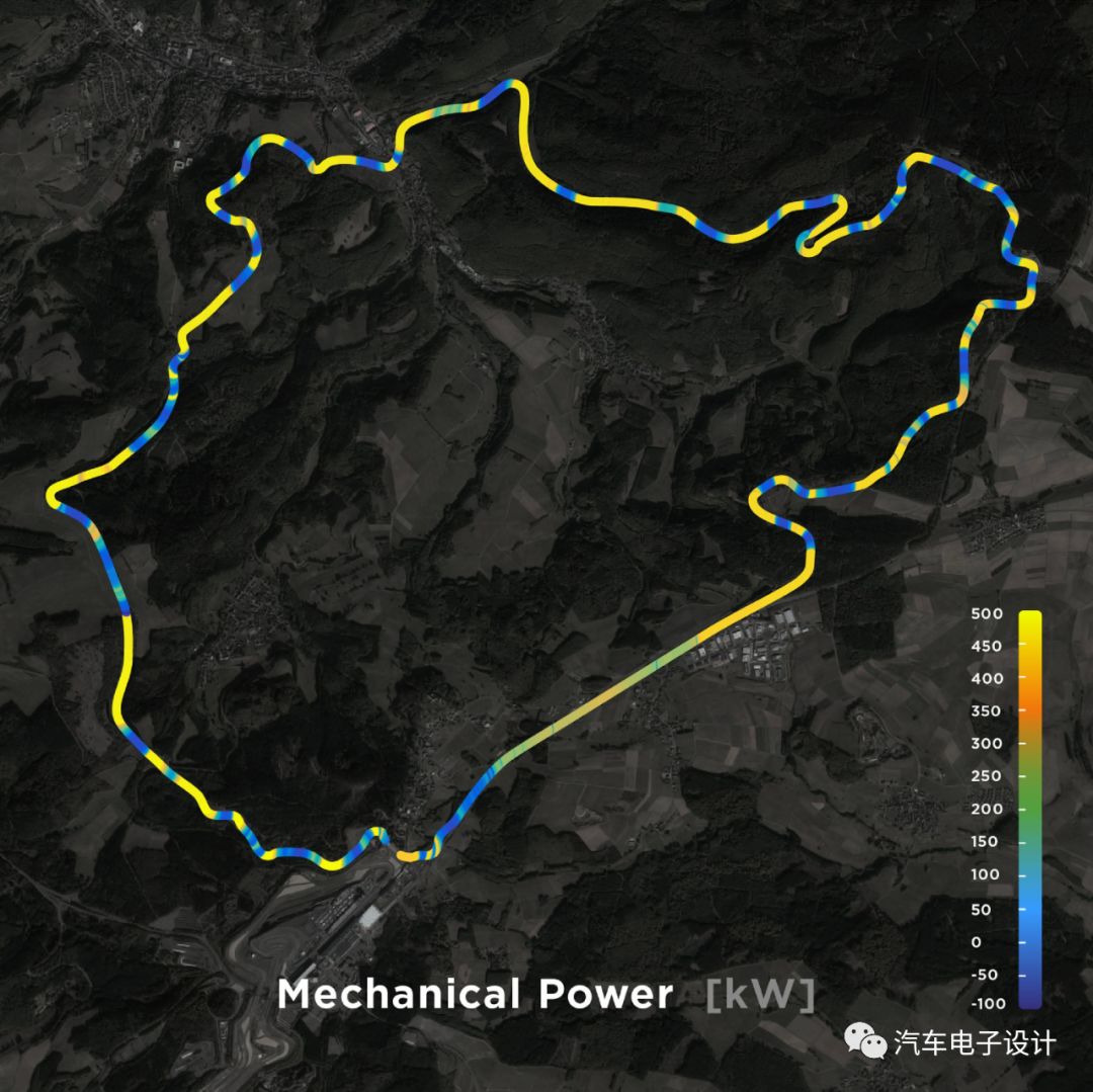这里实际的问题,是在两台基于满电400V和满电800V的两台车,去赛道上去跑,看这个实际的功率在峰值输出500kW,在很长的直道中一致保持在250kW-450kW的输出