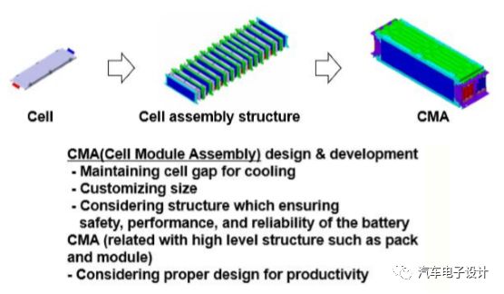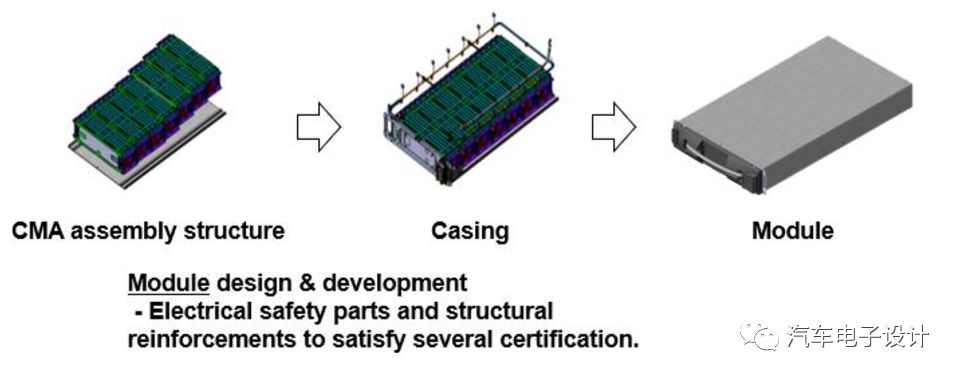基于这个电芯,LG自身是用了标准化的小模块+大模块然后成组的形式来做的,如下所示: