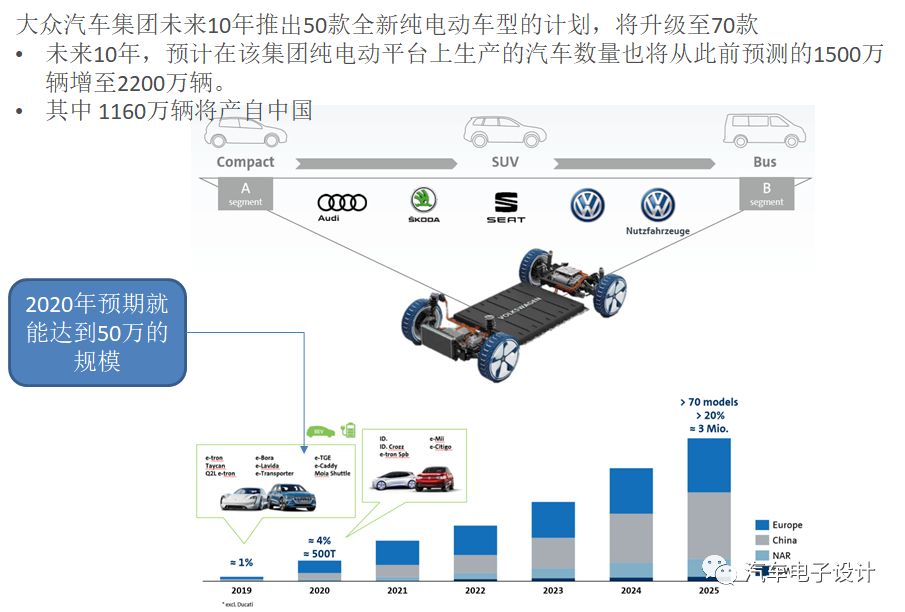 大众给出的数据上量过程是比较好的,预计2019年奥迪e-tron车型的销量就可达到将近20000台,保时捷Taycan车型第一年的计划生产量已全部售空,ID.3的预订量已经基本相当于至2020年中期的规划产量。