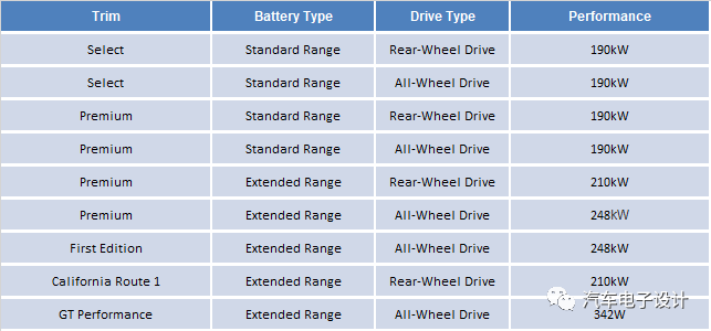 整个车型的配置差异,主要是按搭载电池不同(标准和长续航两种版本),从目前发布的示意图来看,也是采取了平板化的电池,并且利用了第二排座椅的空间来放置需要到100kWh的电池。