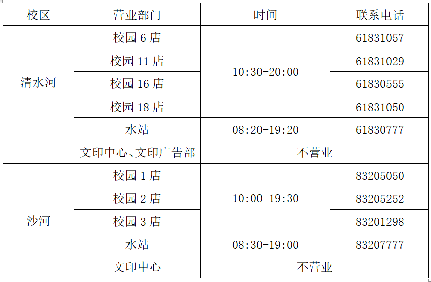 10月5-8日,校园超市、校园水业各门店恢复正常营业,文印中心营业时间 9:00-17:00。