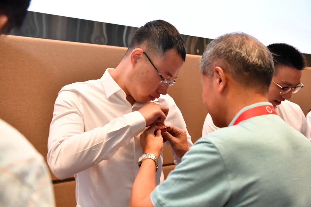 会上举行了退休教师荣休仪式和新进教师入职仪式,退休教师代表为新进教师代表佩戴校牌。