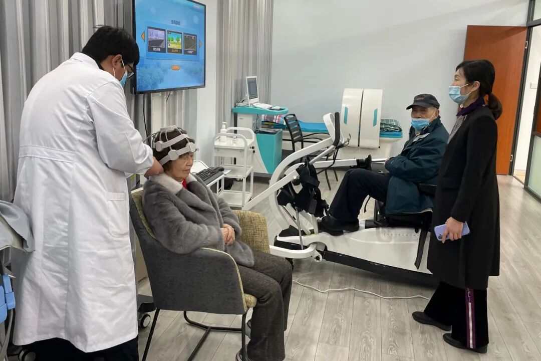 老同志正在进行经颅磁治疗和四肢撩动康复训练