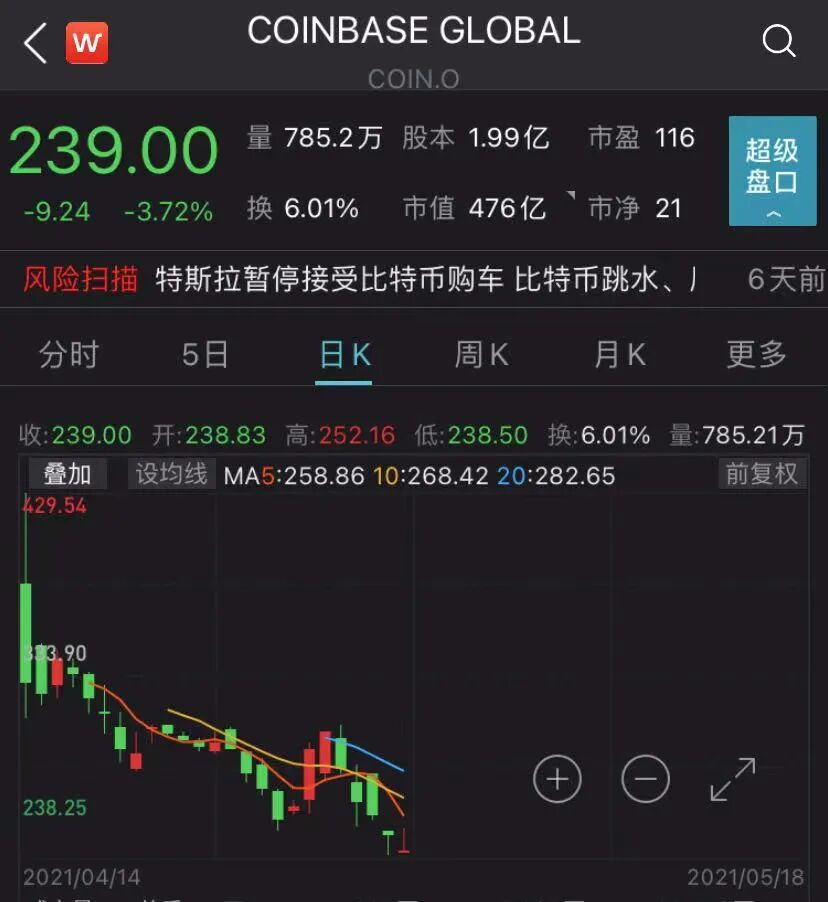 作为“加密资产第一股”的Coinbase本身股价也不乐观。美东时间4月14日,该交易平台登陆纳斯达克,开盘价达381美元,涨幅高达52%,随后Coinbase股价迅速飙升至429.54美元,涨幅为72%,市值超过千亿美元。但是此后除了5月7日开启的3日涨幅之外,基本一路掉头向下,截至5月18日收盘价为239美元,当天跌幅3.72%,已经快要跌至此前最高股价的一半。