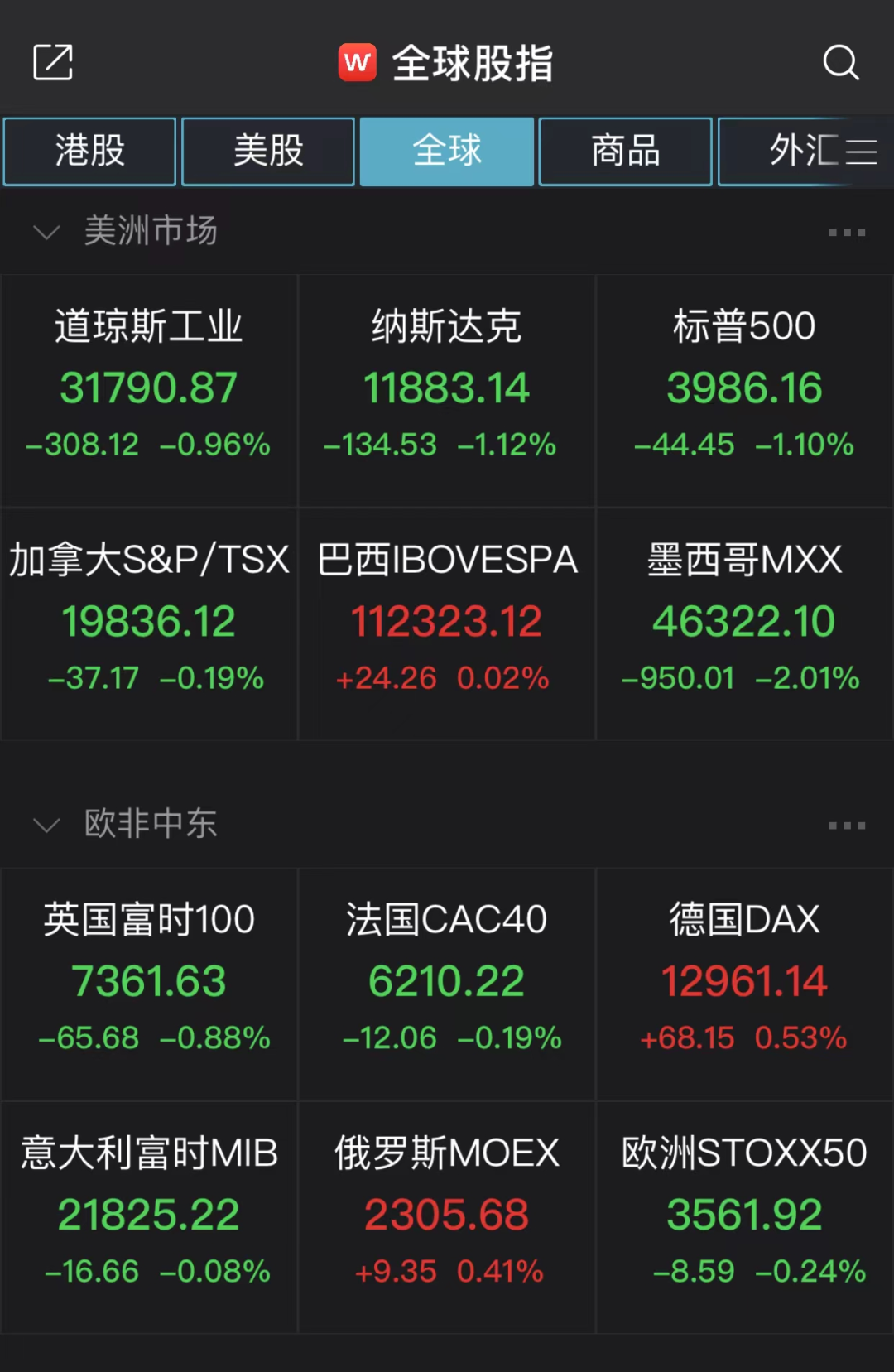 科技股全线下跌,苹果、Meta、奈飞、谷歌、微软、亚马逊分别下跌1.53%、1.26%、1.75%、0.44%、0.85%、0.82%。热门中概股多数下跌,阿里巴巴下跌2.87%,哔哩哔哩下跌3.34%,京东下跌1.30%,百度下跌6.54%,小鹏汽车下跌1.35%,理想汽车下跌1.06%,拼多多上涨0.70%。![]()