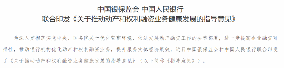 银保监会官网9月29日消息,近日银保监会和中国人民银行联合印发了《关于推动动产和权利融资业务健康发展的指导意见》。