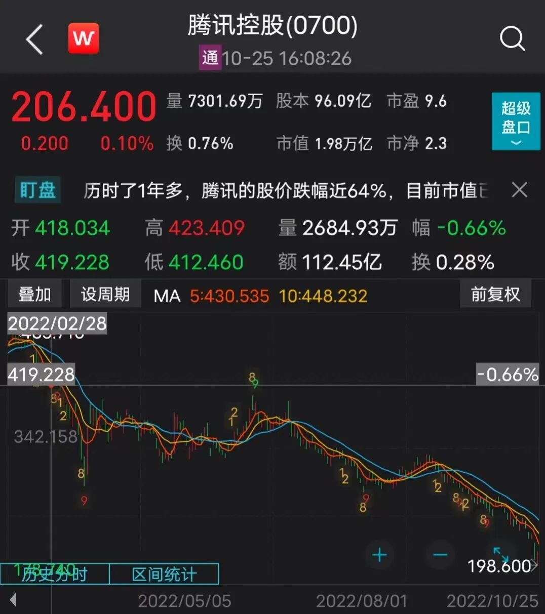 段永平月内两度出手,与腾讯近期的股价跌幅关系密切。10月24日,港股互联网板块集体大跌,腾讯当日下跌11.43%,创下今年以来最大跌幅。10月25日,腾讯盘中一度跌破200港元大关,不过随后一路上扬至翻红,截至收盘报收于206.4港元/股。