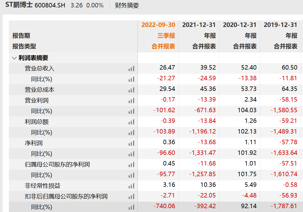 值得注意的是,2019年至2022年前三季度,ST鹏博士(公司主营业务分为四个板块,分别是智慧云网、数据中心、家庭宽带及增值、产业互联网及数字经济产业园)营收规模逐渐萎缩,扣非后归母净利润均为负值。2021年,公司还被出具否定意见的审计报告,公司股票因此被实施其他风险警示。