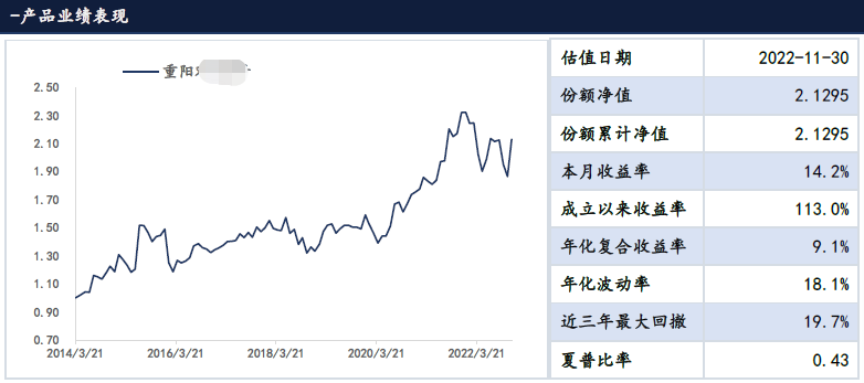 此外,来自朝阳永续等第三方机构的数据也显示,重阳投资旗下多只投顾类产品,11月的净值涨幅也在15%左右。