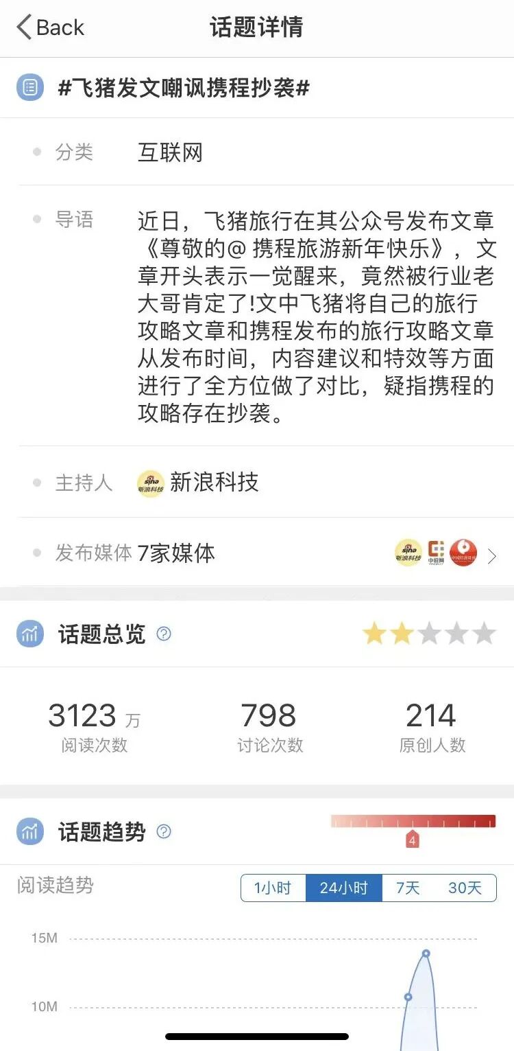 飞猪文章发布后,相关话题在各大社交平台引起关注,一度冲上微博热搜。截至1月12日18:30分,仅在微博平台,“#飞猪发文嘲讽携程抄袭”话题就获得3123万次阅读。