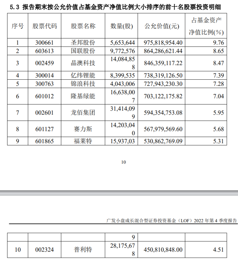 与2022年三季度末相比,广发小盘成长前十大重仓股变化不大,普利特进入前十大重仓股,健帆生物退出前十大重仓股。同时,广发小盘成长权益投资占基金总资产的比例由三季度末的87.73%提升至四季度末的93.51%。