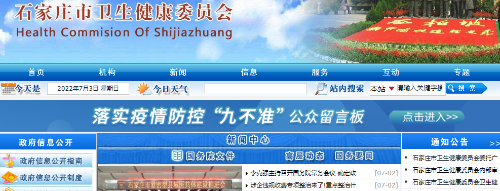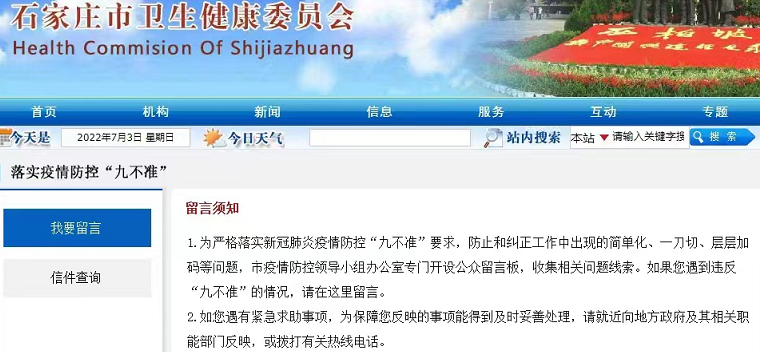 为严格落实国务院联防联控机制疫情防控“九不准”要求,高效解决各地群众反映的疫情防控“层层加码”问题,石家庄市开设落实疫情防控“九不准”公众留言板,面向社会收集我市违反“九不准”要求的问题线索。留言板设在石家庄市卫生健康委员会官网首页(网址为http://wsjk.sjz.gov.cn/),公众可在此进行留言投诉。并同步开通落实疫情防控“九不准”举报热线电话0311-12345,接受群众投诉和政策咨询。