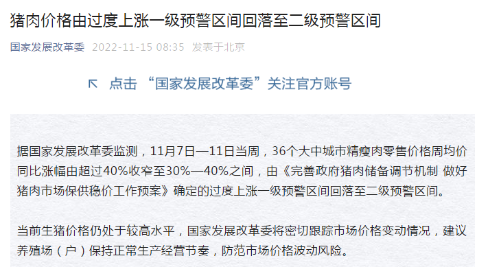 11月16日,国家发展改革委政研室副主任、新闻发言人孟玮在国家发展改革委召开的11月份例行新闻发布会上指出,总体判断,今后一段时间生猪猪肉市场供应有保障,价格有望保持相对平稳态势,难以出现大幅上涨的情形。