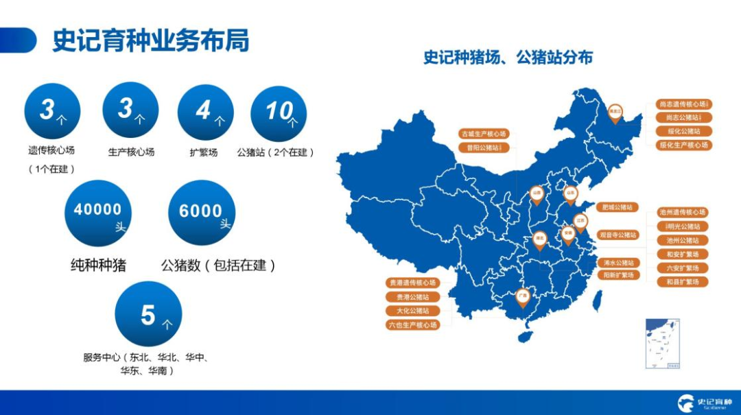 据介绍,目前史记生物拥有遗传核心场2个,在建核心场1个,生产核心场3个,扩繁场4个,纯种种猪规模4万余头;有8个在运行的公猪站,2个在建公猪站,公猪存栏(含在建)逾6,000头。在东北、华北、华中、华东、华南设有5个服务中心。傅衍表示,史记生物种猪销量处于头部地位,特别是纯种GGP的销售数量在国内处于领先位置,透露预计今年种猪销量可达到20万头(10月14.9万头),精液销量(包括冷冻精液)可达350万份。