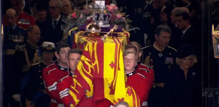 在所有人的见证下,女王的灵柩,由皇室成员护送着,进入威斯敏斯特修道院内。