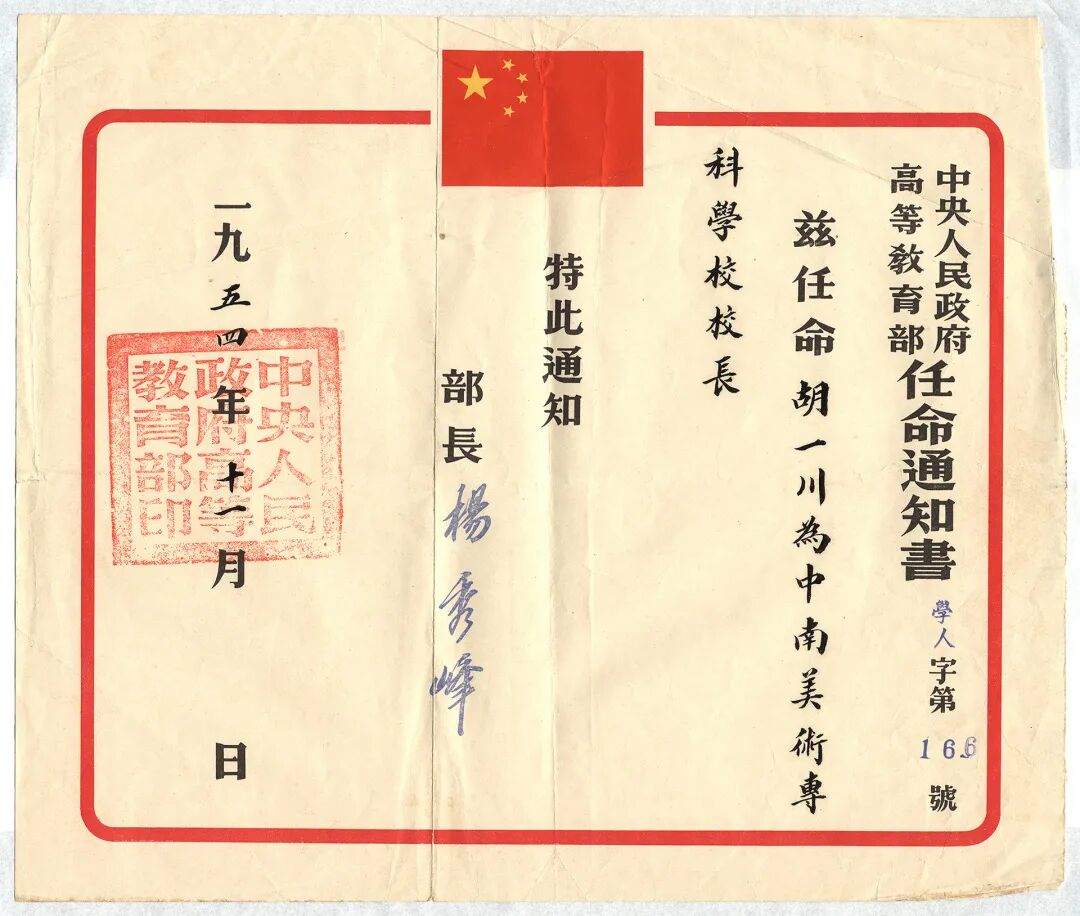 1954年,中央人民政府高等教育部部长杨秀峰任命胡一川为中南美术专科学校校长任命书(广州美术学院提供)