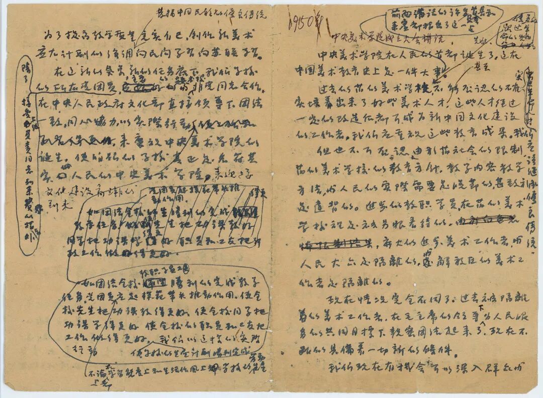 1950年4月1日,胡一川在中央美术学院成立大会讲话手稿(广州美术学院提供)