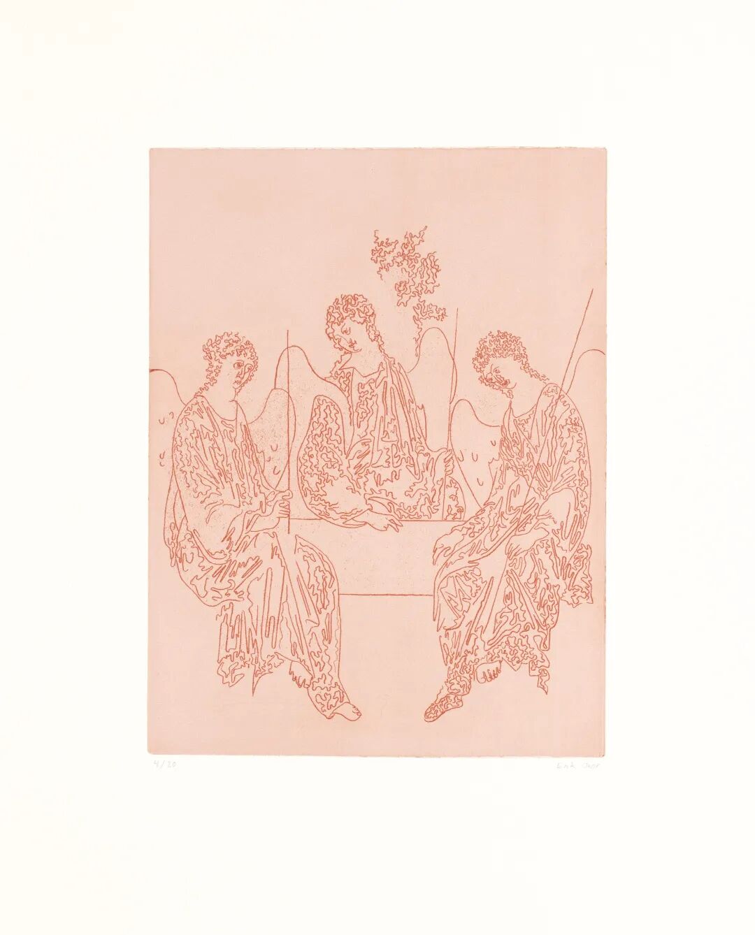 For twenty years or so, Erik Jeor has lived with Andrei Rublev's icons, wrestled with them, pondered them and sometimes even refused them. But in the encounter with the icons in the soft ground of copper printmaking, something happened that suddenly made them unreservedly enjoyable. He now presents five soft ground etchings, in dialogue with Andrei Rublev's famous icons.