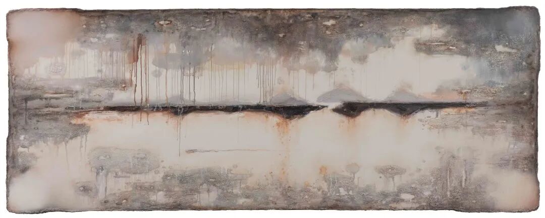 “边际”系列的媒介与主题表达,统一在“时间性”这一概念之中。一方面,时间性贯穿于创作的过程中,“时间一直与画家或艺术家同在,他或者她活在时间里,画笔与她一起度过许多瞬间,在画的过程中回味许多瞬间,选择性地记住或表述瞬间。”而媒介的时间,也是个人性的时间,其表达的实质,通过堆叠的材料制造出的特殊边缘——令人联想起被焚毁、被破坏、被时间自然侵蚀之物——象征直指古旧之物。而“古物”并不完全是某种复古情怀的符号,更是整体性时间的容器,种种复杂的情绪与历史、文化的指涉交织其中。