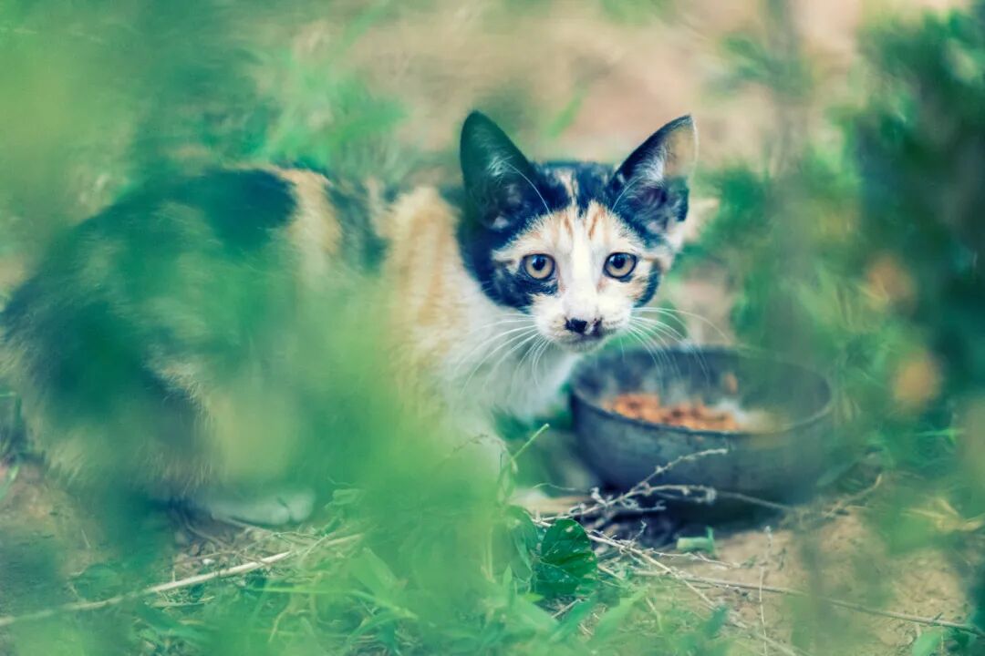 我边走边摇猫粮,很快,好几只猫钻出来巴巴地望着。我撒在地上站远一点,它们就飞快拢过去了。大太阳底下,枯黄的草皮冒出一点新绿。四下安静,只听到猫子们细细的咀嚼声。我在小区绕了一圈,一共撒了三处猫粮,看到了6、7只猫。我不确定它们是原先在的还是后来来的。