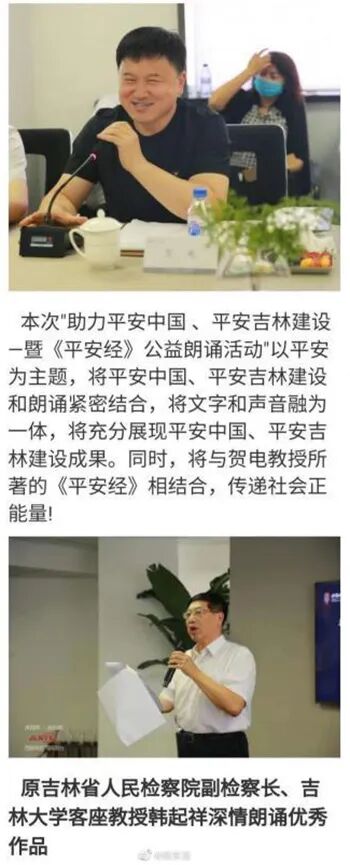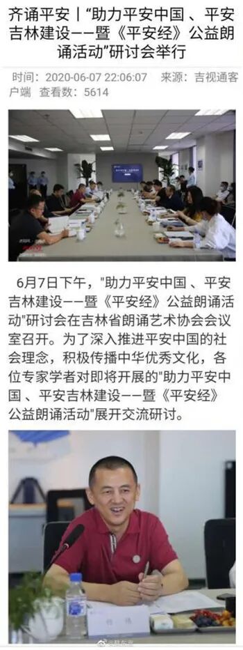 其三,这样的劣书烂书何以能够正式出版,而且还受到了吉林省当地文宣部门大力推广宣传,众多学者,媒体的追捧?这实在是令人匪夷所思。据称,《平安经》公益朗诵活动研讨会6月7日在长春召开,巜长春日报》,巜吉林日报》均公开报道,长春广播电视台等媒体进行展播。吉林省人民政府新闻办公室转载。“中国吉林网““吉林应急管理”等多家吉林省当地官方微信公众号为这本《平安经》背书,发表了所谓的“拜读《平安经》感言”的文章,并且在文末向读者隆重推荐。